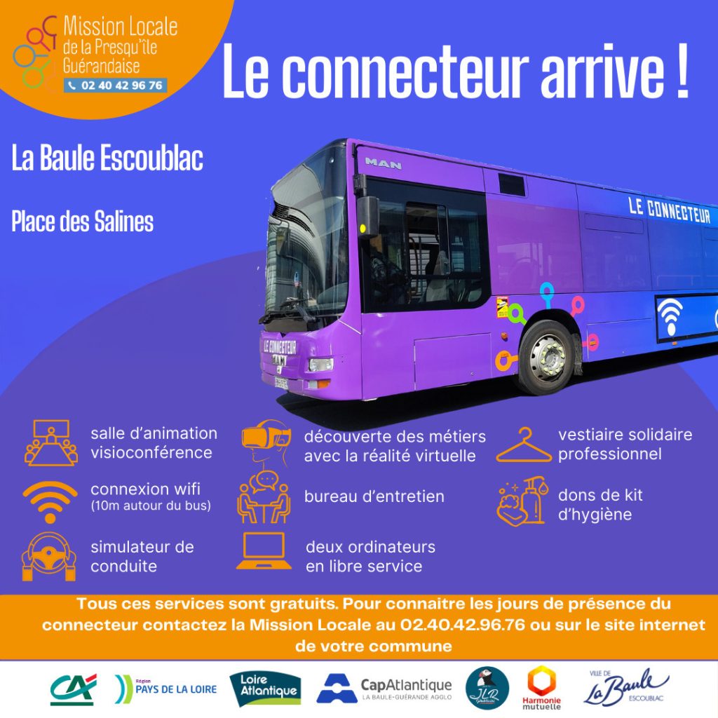 Le Bus Connecteur sera présent à La Baule-Escoublac. Ce bus, destiné aux jeunes de 16 à 25 ans, propose les services suivants : Orientation et insertion professionnelle : Conseils pour la r…