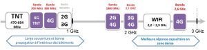 En France, les services de très haut débit mobile 4G peuvent se déployer dans cinq bandes de fréquences : 700 MHz, 800 MHz, 1800 MHz, 2,1 GHz et 2,6 GHz.